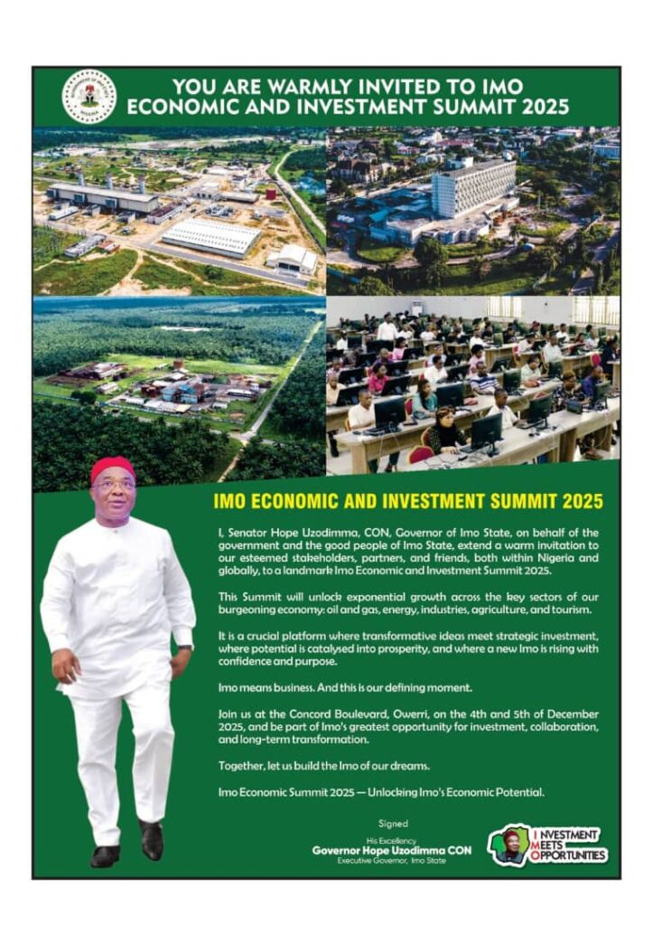 I, Senator Hope Uzodimma, CON, Governor of Imo State, on behalf of the Government and the good people of Imo State, extend a warm invitation to our esteemed stakeholders, partners, and friends, both within Nigeria and globally, to a landmark Imo Economic and Investment Summit 2025.